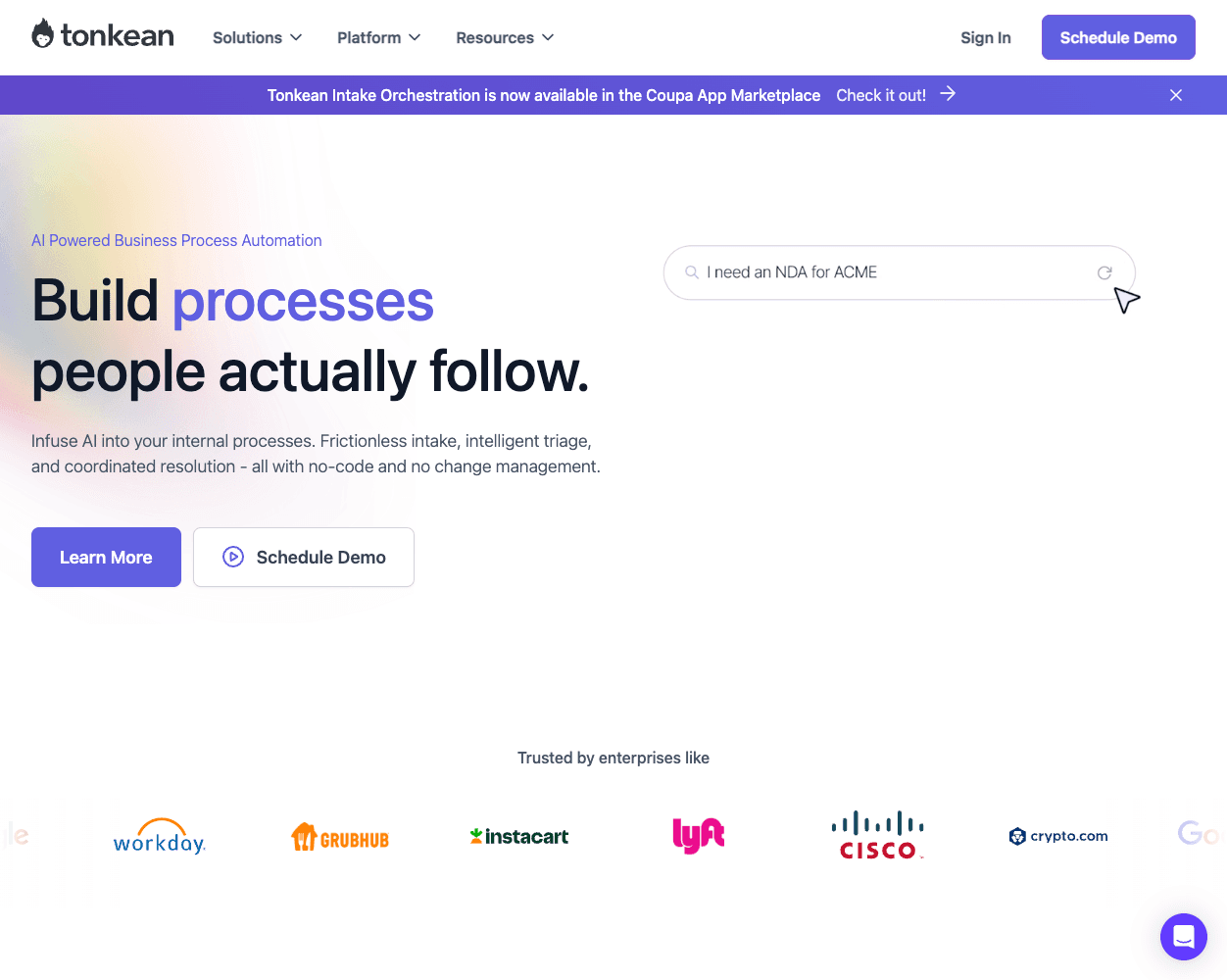 Tonkean is a technology company that develops an AI-powered platform designed to automate and optimize business processes. Their primary offerings include the AI Front Door, an intelligent and proactive entry point for requesters, and a No-Code Process Builder that allows operations teams to customize processes without coding. Tonkean's platform is focused on automating end-to-end processes, integrating with various data sources, and enhancing legal intake forms with AI capabilities.