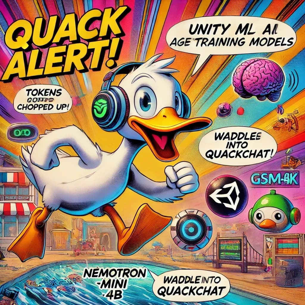 ๐ฆ Quack Alert! AI's stirring up a tech tornado! ๐ค Tokenization tricks: Is your title already chopped up? ๐ฎ Unity ML Agents: Training language models in a virtual playground! ๐ง GSM8K dataset: Teaching AI to reason like a pro! ๐ผ๏ธ Nemotron-Mini-4B: The little model that packs a punch! ๐ฃ๏ธ Parler TTS: Making AI speak your language! Plus, are we entering a new era of 3D content creation? Let's sculpt some pixels! Waddle into QuackChat now - where AI news meets web-footed wisdom! ๐ฆ๐ป๐จ