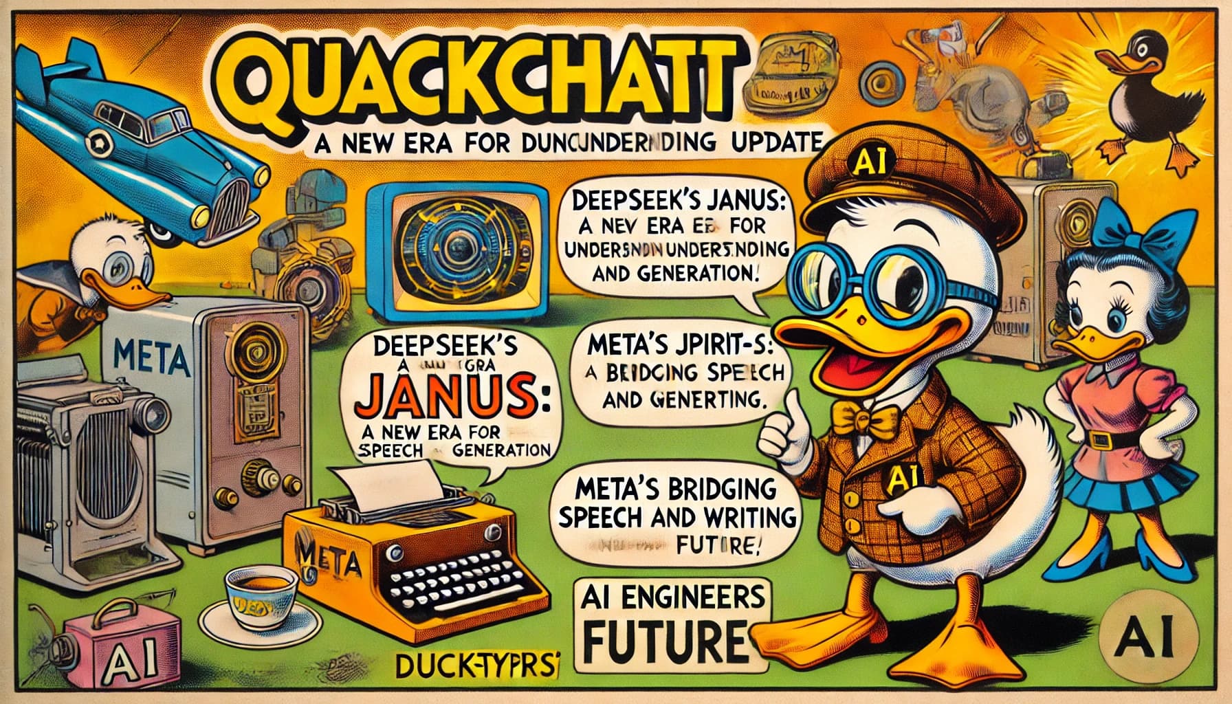 QuackChat: The DuckTypers' Daily AI Update brings you: ๐ง DeepSeek's Janus: A new era for image understanding and generation ๐ฃ๏ธ Meta's SpiRit-LM: Bridging the gap between speech and writing ๐ฌ Detailed performance comparisons and real-world implications ๐ What these advancements mean for AI engineers Dive into the future of multimodal AI with us!